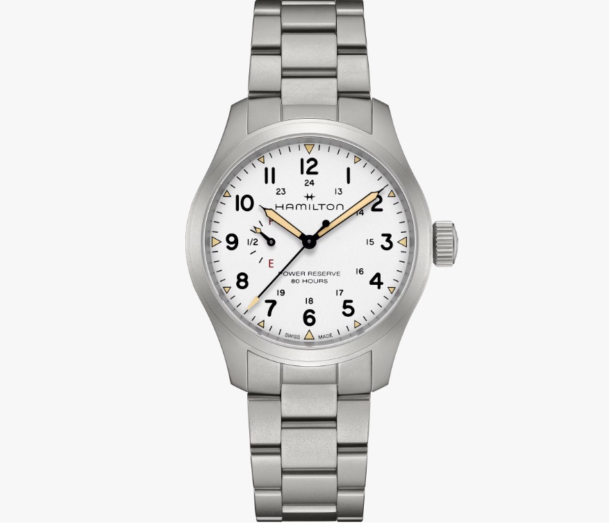 Il Khaki Field Mechanical Power Reserve 40 mm rende omaggio al design tradizionale e alla funzionalità essenziale della famiglia Khaki, introducendo al contempo caratteristiche moderne e le ultime novità in fatto di tecnologia e innovazione orologiere. Dotato di un nuovo movimento a carica manuale H-23, sviluppato da ETA in esclusiva per Hamilton, consente per la prima volta di visualizzare direttamente sul quadrante la riserva di carica di 80 ore. Dotato di un bracciale in acciaio, il quadrante bianco mostra le diciture “power reserve 80 hours” (“riserva di carica di 80 ore”), “F” (completamente carico) ed “E” (scarico), sottolineando questa caratteristica funzionale d’eccezione.